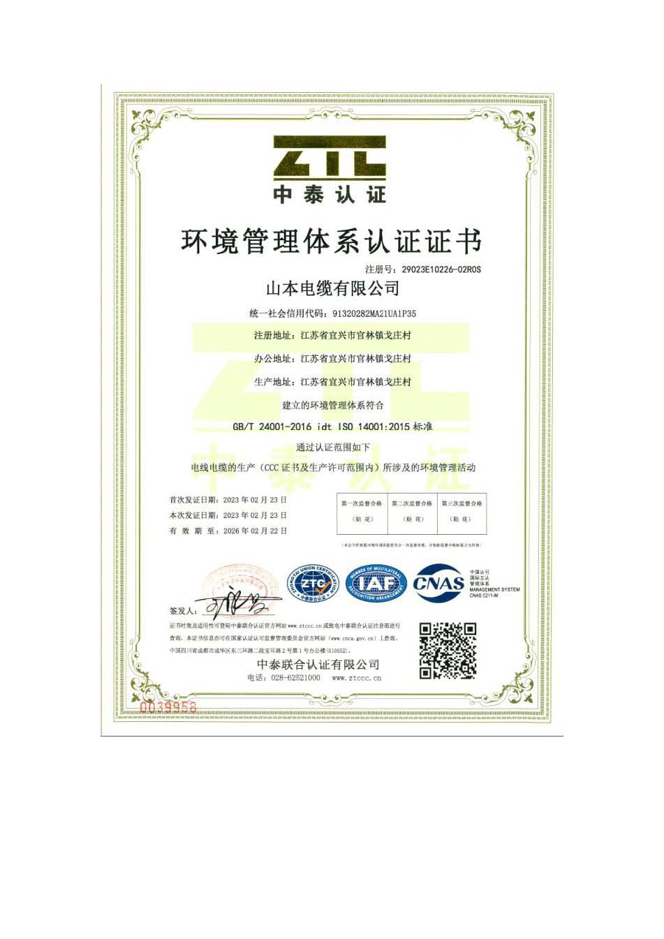 环境管理体系认证证书