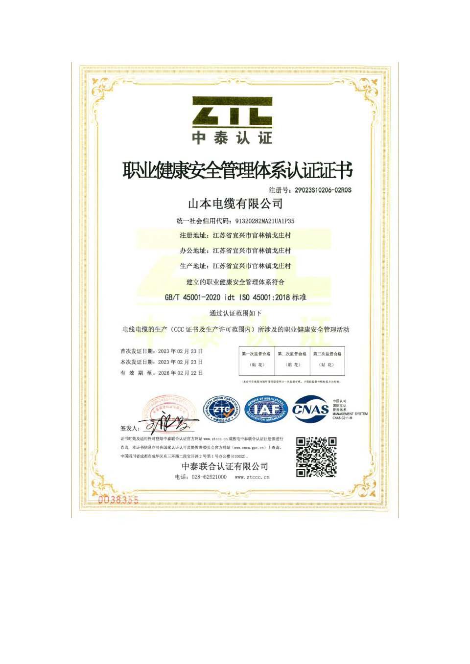 职业健康安全管理体系认证证书