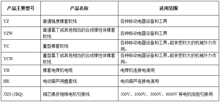 YZ、YZW、YC、YCW 适用于额定电压0.6/1kV及以下家用电器、电动工具和各种移动式电器设备的电源连接。